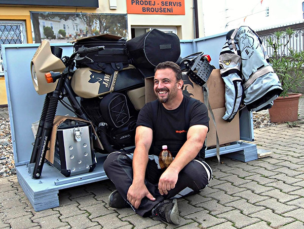Pavel: Jawa kolem světa je od začátku nastavena jako „made in Czechoslovakia“, což už předem ukazuje, na koho se obrátit. Když se k tomu přičetly předchozí výborné zkušenosti s výrobky z Tlumačova a letitá bezproblémová spolupráce z novinářské branže, byli Hubíkovi první, na koho jsem se obrátil.