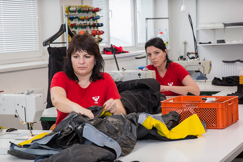 Závěrem zbývá kontrola ušitého výrobku, vložení chráničů, očištění a vzorek je předán k testování.