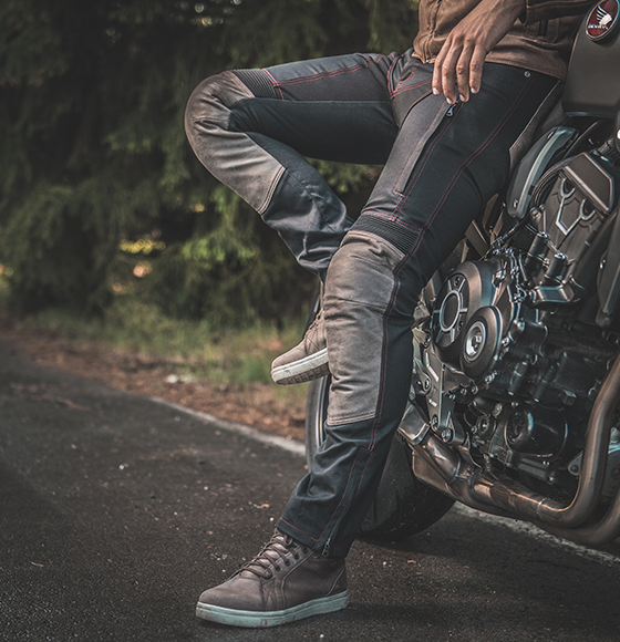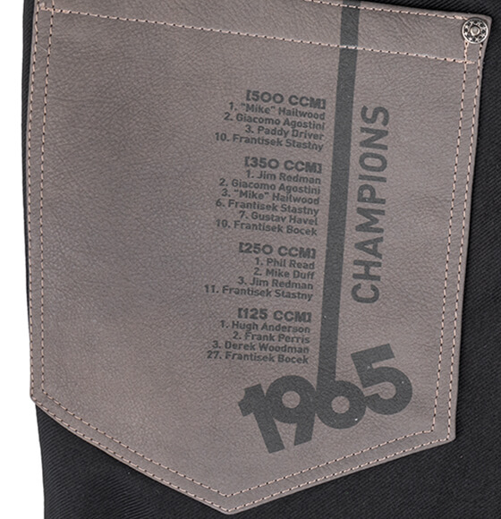 Hledáte moto kalhoty riflového stylu na léto, ale požadujete vyšší bezpečnost? Kalhoty CHAMPIONS 65 splňují nejvyšší nároky na prodyšnost v horkých měsících díky svrchní textilii s podílem bavlny a navíc regulovatelnému větrání na stehnech. Ochranu vám zajistí podíl vysocepevnostní cordury, výrazné zesílení exponovaných míst kůží a kevlarem od švýcarské společnosti Schoeller® a chrániče, které jsou umístěny tak, aby nerušily design a neomezovaly váš komfort. Unikátní kalhoty jsou navrženy ing. Liborem Hubíkem, který skloubil retro styl se současnými požadavky na maximální bezpečnost v motoodívání. Použil nejmodernější materiály a technické konstrukční řešení. Grafika odkazuje na úspěšnou motoristickou historii českých jezdců 60-tých let. Důkazem je výsledková listina z roku 1965, kterou objevíte na kalhotách v zadu na kožených kapsách. Ty mají kromě "informativního" charakteru i funkci ochrany vašich boků a sedací části a to díky použitému materiálu (hovězina), jejich velikostí, tvaru a umístění. Pohodlí je zajištěno perfektním střihem s vyšším anatomickým sedem. Kevlarová streč v rozkroku umožní snadný pohyb na motocyklu. Spodní část nohavic je řešena na boty, kdy pomocí zipů po stranách snadně kalhoty přetáhnete přes motoobuv. Kovové zipy EXCELA se vyznačují zaoblenými zuby, které omezují poškrábání a mají zvýšenou pevnost. Kalhoty jsou určeny na pohodové cestování v létě. Budete vypadat stylově a cítit se bezpečně!