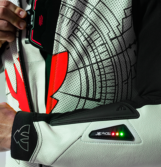 Kombinéza se zabudovaným airbagem TECH-AIR®. Nejvyšší stupeň ochrany! Systém pracuje elektronicky na základě softwaru ACU (Airbag Control Unit), který vyhodnocuje nebezpečnou situaci pro jezdce a v případě ohrožení se aktivuje. Výhodou je, že nejste k motocyklu připoutání žádným lankem. Dalším plusem elektronického řízení je, že nemusíte být na signálu, který vyžadují systémy s napojením na GPS. Airbag chrání v rozsahu 360° horní části těla. Zpevní ramena, hrudník, horní část břicha, záda a oblast ledvin. Kombinéza RACING GRID je pro airbag TECH-AIR® konstrukčně upravena a dodává se včetně kompletního systému. Je určena zejména na závodní tratě, proto je v základním vybavení veškerá racingová výbava. Obrovskou výhodou je, že Airbag TECH-AIR® lze konfigurovat z módu RACE (pro závody) do módu STREET (na cestu). Má dvě bombičky, v případě nehody na cestě se aktivují obě najednou a naplní se do neuvěřitelných 25 ms. Na závodní trati se plní nejprve jedna a po té vám zůstává ještě jedna možnost ochrany. Zvyšte svou bezpečnost na cestách, jezděte s airbagem!