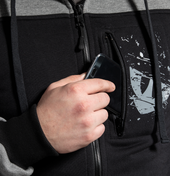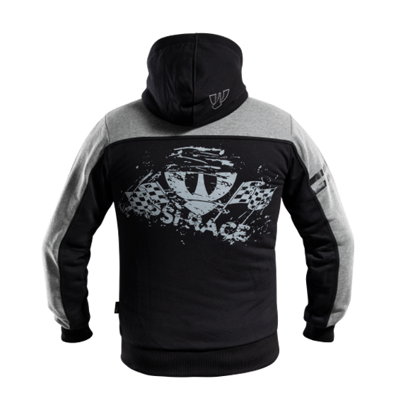 Pánská mikina s motorkářským motivem na zádech (sítotisk) - inspirováno závody Klasiků na přírodních tratích. Skvěle sedí na těle a neomezuje v pohybu. Zapínání na zip až ke krku do stojáčku. Přední a zadní díly včetně kapuce jsou podšity umělým kožíškem v šedé barvě, dá se tedy použít i jako lehká bunda. Boční kapsy a kapsa na mobil na hrudníku jsou uzavíratelné na zipy. Logo na kapuci je reflexní. Rukávy a spodní okraj je ukončen příjemnými úpletovými patenty. Celoroční použití.